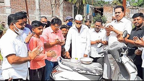 एक वर्ष उलटले रस्त्याचे काम अपूर्ण आहे. रस्ते कामासाठी आणलेले डांबर बॉयलर मशीन रस्त्यावरच वर्षभर धूळ खात पडून आहे. या मशीनला हारतुऱ्यांनी सजवून रखडलेल्या कामाचा निषेध केला. गांधीगिरी मार्गाने अनोख्या पद्धतीने खराब रस्त्यांबाबत रोष व्यक्त करत नागरिकांनी नगरपालिकेला जागे केले.