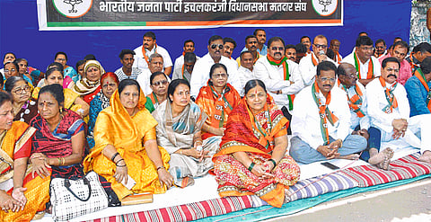 इचलकरंजी - शेतकऱ्यांच्या वाढत्या आत्महत्या, नव्या कर्जमाफी योजनेतील त्रुटी, सरकारचे ठळकपणे दिसणारे अपयश, महिलांवरील वाढत्या अत्याचाराच्या घटना आदी प्रश्नांबाबत राज्यातील महाविकास आघाडी सरकार अपयशी ठरल्याच्या निषेधार्थ भारतीय जनता पार्टीच्यावतीने मंगळवारी प्रांत कार्यालयाबाहेर धरणे आंदोलन केले. यावेळी राज्य शासनाच्या विरोधात जोरदार घोषणा देण्यात आल्या.