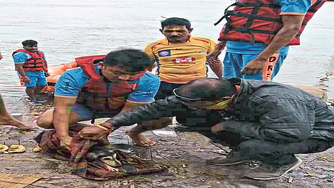 कोल्हापूर : कसबा बावडा येथील पंचगंगा नदीत राजाराम बंधाऱ्याला लागून असलेल्या एका शेडवर पाच दिवसांपासून पुराच्या पाण्यात अडकलेल्या श्वानाला आपत्ती व्यवस्थापन पथकातील जवानांनी जीवदान दिले. भुकेने व्याकूळ झालेल्या आणि चार दिवस भुंकत असलेल्या या श्वानाला नदीकाठावर आणताच त्याने धूम ठोकली.