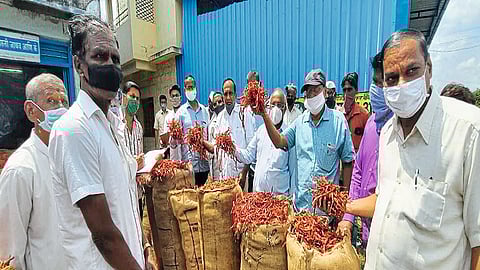 मार्चपासून लॉकडाऊन सुरू झाल्यानंतर सारेच व्यवहार ठप्प होते. त्यात बाजार समिती आवारातील गुळ व मिरचीचे सौदे बंद झाले होते. मध्यंतरी अनलॉकनंतर मिरची विक्री सुरू होती. सौदे बंद होते. सहा महिन्यानंतर या हंगामातील मिरची पिकाचा सौदा आज सुरू झाला. समितीचे सचिव बाळासाहेब चव्हाण यांच्या हस्ते सौद्याला प्रारंभ झाला. मे. एन. एम. जाधव अडत दुकानात मिरची सौद्याला सुरूवात झाली.