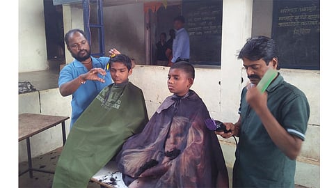 मुलांच्या केस कटिंगसाठी शिक्षक ही राबत आहेत
