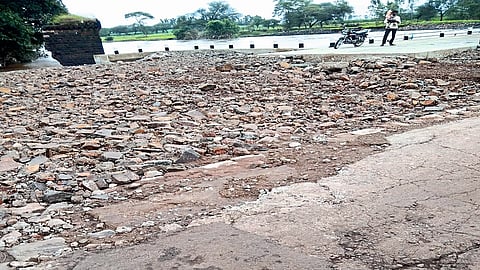 बंधाऱ्याचे अनेक गार्ड स्टोन फुटले आहेत. गार्ड स्टोनमध्ये संरक्षणासाठी बसविलेल्या लोखंडी पाइप वाकल्या आहेत. काही पाईप्स गायब झाल्या आहेत. पावसामुळे भराव वाहून गेलेल्या ठिकाणी प्रशासनाने दगड टाकले आहेत. त्यामुळे या बंधाऱ्यावरून वाहतूक पूर्णपणे बंद झाली आहे. सध्या जीर्ण झालेल्या जुन्या बंधाऱ्यावरूनच वाहतूक सुरू आहे.