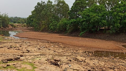 नदीतील पाण्याचा अडथळा होऊ नये व बांधकाम वेगाने व्हावे म्हणून नवीन पुलाच्या शेजारी मातीचा बांध घालून पाणी अडविले आहे. त्यामुळे बंधाऱ्याच्या खालचे नदीपात्र उघडे पडले. उन्हाळा असल्याने पाण्याचा उपसा वाढला आहे. त्यामुळे असलेले पाणी संपल्याने नदीपात्र कोरडे पडले. कोवाडपासून कालकुंद्री, कागणी व दुंडगे येथील शेतकऱ्यांचे शेकडो कृषिपंप नदीवर आहेत.