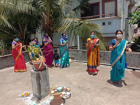 कोल्हापूर - सोशल डिस्टन्सिंगचे नियम पाळत मास्क बांधून आज महिलांनी वटपौर्णिमेचा सण साजरा केला. 'जन्मोजन्मी हाच पती लाभू दे' हे मागणे मागत महिला वडाची मनोभावे पुजा दरवर्षी करत होत्या. यंदा मात्र कोरोनाच्या संकटामुळे घरोघरी, गल्लीत वटपौर्णिमा साजरी झाली. एकाच वेळी गल्लीतील सर्वजणी मिळून वडाची पुजा करत होत्या. यावर्षी या सणाला हे चित्र बदलले. अवघ्या पाच - सहा जणींनी गल्लीत, टेरेसवर कुंडीत वडाच्या झाडाचे रोप लावून वटपौर्णिमा साजरी केली. काही जणींनी अंगणातील तुळशीलाच प्रतिक मानून पुजन केले.
