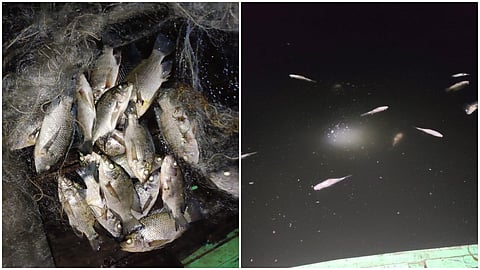 केत्तूर (सोलापूर) : उजनी जलाशयाचे पाणी वरचेवर प्रदूषित होत आहे. त्यातच उजनी बॅकवॉटर परिसरातील करमाळा तालुक्यातील सोगाव परिसरात जलाशयातील पाण्याला आता काळसर रंग आल्याने जलाशयाच्या कडेला अडचणीच्या जागेमध्ये अधिवासात लपलेले मासे मरण पावत असल्याचे दिसून येत आहे. गेल्या तीन-चार दिवसांपासून या ठिकाणी जाळीद्वारे मासेमारी करणारे पदमेश नगरे यांच्या जाळ्यात मृत मासे सापडण्याचे प्रमाण वाढले आहे. तर पाण्यावरही मृत मासे तरंगताना दिसत आहेत. पाणी प्रदूषणामुळे उजनी जलाशयातील माशांचा श्वास गुदमरतोय, हे यावरून स्पष्ट होत आहे.