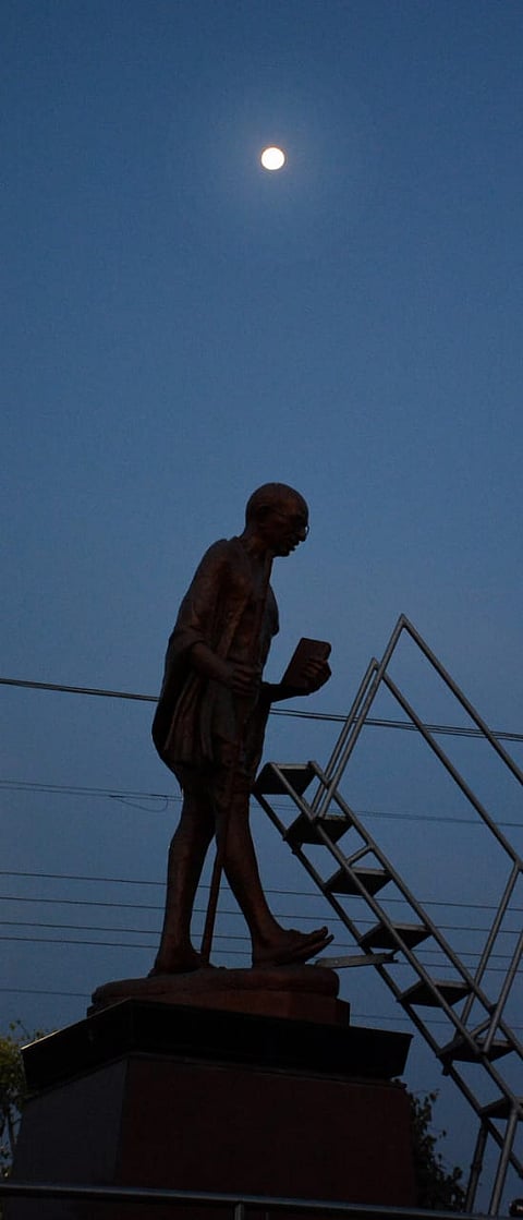 सोलापूर : सोलापूर शहर हे पुतळ्यांचे शहर म्हणून ओळखले जाते. शहरातील प्रत्येक चौकात एका महामानवाचा पुतळा आहे. इतके सारे पुतळे उभारल्यानंतर त्याची निगा राखणे, स्वच्छता ठेवणे, पुरेशी प्रकाशाची व्यवस्था करणे ही महापालिका प्रशासनाची जबाबदारी आहे. मात्र, शहरातील रेल्वे स्थानकासमोरील महात्मा गांधीजींचा पुतळा मागील वीस दिवसांपासून अंधारात आहे. याकडे कुणाचेही लक्ष नसल्याने जगाला मानवतेचा प्रकाश देणारे गांधींजी सध्या अंधारात आहेत.