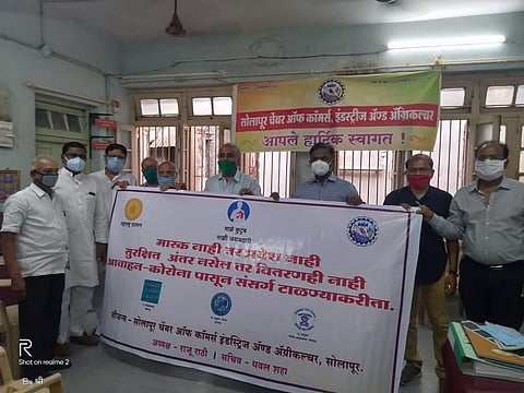 "माझे कुटुंब, माझी जबाबदारी" या मोहिमे अंतर्गत सोलापूर महानगरपालिका व सोलापूर चेंबर ऑफ कॉमर्स, इंडस्ट्रीज अँड ऍग्रीकल्चर यांच्या संयुक्त विद्यमाने शहरातील सर्व व्यापारी पेठांमध्ये " मास्क नाही, तर प्रवेश नाही व नो मास्क, नो एंट्री असे आवाहन करणारे जनजागृती स्टिकर्स तयार करून शहरातील सर्व दुकानांमध्ये लावण्याची मोहिम आखली. तसेच शहरातील सर्व पेट्रोल पंपाच्या ठिकाणी "माझे कुटुंब, माझी जबाबदारी" या मोहिमे अंतर्गत जनजागृतीचे बॅनर लावण्याच्या कामाचा प्रारंभ महानगरपालिकेचे उपायुक्त धनराज पांडे यांच्या हस्ते करण्यात आले. या कार्यक्रमास सोलापूर चेंबर ऑफ कॉमर्स, इंडस्ट्रीज अँड ऍग्रीकल्चर चे अध्यक्ष राजू राठी, मानद सचिव धवल शहा, खजिनदार राजगोपाल झंवर, निलेश पटेल, सुकुमार चंकेश्वरा, संजय कंदले, शैलेश बचुवार, चेतन बाफना, इंदरलाल होतवाणी, रामशेठ पंजवाणी, दयासागर सालुटगी, राजू नाशिककर, महेन्द्र कटारिया, विकी ठक्कर आदी मान्यवर उपस्थित होते.