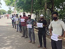 सांगली- कोविड-19 साथरोगाच्या पार्श्वभूमीवर "लॉकडाउन' मुळे फास्टफुड हातगाडे विक्रेत्यांची अडीच महिन्यापासून उपासमार सुरू आहे. त्यामुळे आता खाद्यपदार्थ पार्सल सेवा सुरू करण्यास परवानगी द्या, अन्यथा आम्हाला संस्थात्मक क्वारंटाईन करा अशी मागणी करत सांगली शहर (फास्टफुड) विक्रेते हातगाडी असोसिएशनने आज गांधिगिरी मार्गाने आंदोलन केले. शहरातील प्रमुख चौकाचौकात डोक्यावर पांढरी टोपी आणि तोंडावर काळा मास्क लावून फलक घेऊन शेकडो विक्रेते आंदोलनात सहभागी झाले.