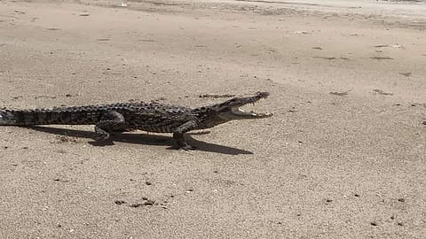 मांगूर : येथील दुधगंगा नदीमध्ये मांगूर-कुन्नूर दरम्यानच्या जुन्या पुलाजवळ शनिवारी (ता. 30) दुपारी अडीच वाजण्याच्या सुमारास ग्रामस्थांना अंदाजे चारफुटी मगरीचे दर्शन झाले. त्यामुळे परिसरात घबराट पसरली आहे.