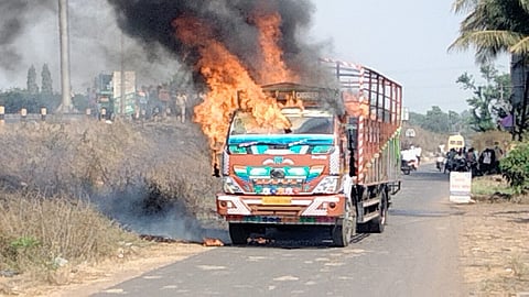 कोगनोळी: राष्ट्रीय महामार्गावर असणाऱ्या कोगनोळी फाट्यावर चालत्या आयशर ट्रकला आग लागल्याची घटना रविवारी (ता. 13) सकाळी 10 वाजण्याच्या सुमारास घडली. `बर्निंग ट्रक`चा थरार यावेळी अनुभवायला मिळाला. आगीत वाहन जळून खाक होऊन मोठे नुकसान झाले आहे. आगीचे उग्र रूप पाहून पोलिसांनी अर्धा तास राष्ट्रीय महामार्ग बंद केला होता.