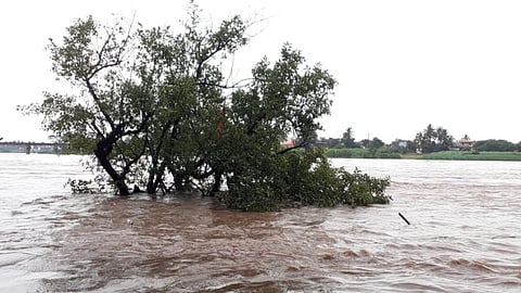 धरणपाणलोट क्षेत्रात पडणार्या मुसळधार पावसाबरोबर कोयना धरणांतून होणाऱ्या विसर्गामुळे शिरोळ तालुक्यातील कृष्णा आणि पंचगंगा नद्यांच्या पाणी पातळीत झपाटय़ाने वाढ झाली. 24 तासात दहा ते बारा फूटाने वाढ झाली आहे. त्यामुळे दत्त मंदिर पाण्याखाली गेले आहे. आज गुरूपौणिमे दिवशीच मंदिर पाण्याखाली गेले असून मंदिराजवळील औदुंबराचे झाडाचे अस्तित्व दिसत आहे. श्री ची उत्सव मूर्ती दर्शनासाठी नारायणस्वामी मठात ठेवण्यात आली आहे. नृसिंहवाडी, कुंरूदवाड भैरेवाडी परिसरातील नागरी वस्तीत पूराचे पाणी आल्याने सुरक्षेच्या दृष्टीने नागरिकांनी सुरक्षित ठिकाणी स्थलांतर केले आहे.शुक्रवारी दिवसभर घरातील साहित्य घेऊन नागरिक स्थलांतरित होत होते.(Datta-temple-in-Nrusinhawadi-underwater-kolhapur-rain-update-kurundwad-Ichlkarnji-rainfall-live-news-akb84)