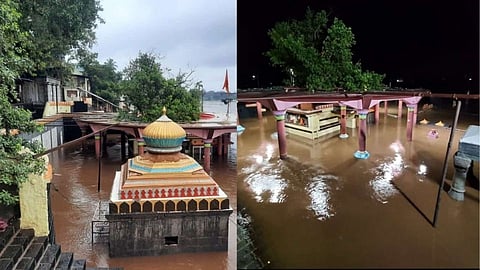 कोल्हापूर: नृसिंहवाडी( Nrusinhwadi)येथे कृष्णा-पंचगंगा नदीच्या (Krishna-Panchganga river)पाणी पातळीत पुन्हा रात्रीत 10 फुटाने पाणी पातळीत वाढ झाली असून या मौसमातील पहिला दक्षिणद्वार सोहळा पहाटे दोन वाजता भाविकांच्या स्नानाच्या पर्वणीविना दत्तमंदिरात संपन्न झाला. दोन दिवसात येथे तब्बल वीस फूट पाणीपातळी वाढल्याने महापुराच्या धास्तीने ग्रामस्थांच्यामध्ये भीतीचे वातावरण पसरले आहे. (nrusinhwadi-shree-datta-temple-area-20-feet-of-water-level-rain-update-kurundwad-marathi-news)