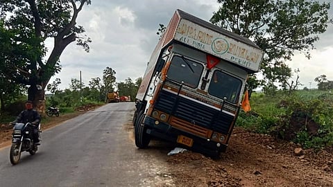 हळदी : राधानगरी राज्यमार्गावर (radhanagari road) हळदी (ता.करवीर) व कोथळी दरम्यान गोव्याहून (goa) कोल्हापूरमार्गे दिल्लीला (kolahpur to delhi) जाणारा मालवाहू ट्रक अरुंद रस्त्यावरून खाली घसरला. मात्र चालकाच्या प्रसंगावधानामुळे मोठी दुर्घटना टळली.
