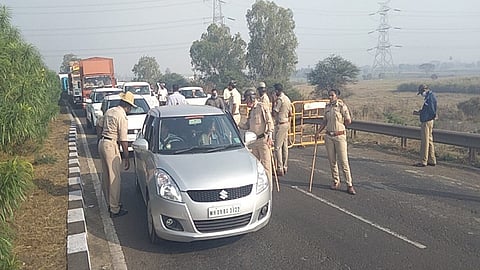 कोगनोळी (बेळगाव) : बेळगाव येथे मराठी भाषिकांतर्फे आज (ता. २१) महापालिकेवर काढण्यात येणारा मोर्चा स्थगित केला आहे. या मोर्चाला पोलिसांकडून परवानगी नाकारण्यात आली आहे. त्या पार्श्वभूमीवर कायदा व सुव्यवस्था सुरळीत राहण्यासह दक्षता म्हणून राष्ट्रीय महामार्गावर कोगनोळीजवळ सकाळपासूनच अर्ध्यावर बॅरिकेड्स लावून पोलिस बंदोबस्त कडक करण्यात आला. पोलिसांनी काही वाहनांना परतही पाठविले. यावेळी महामार्गावर वाहनांची रांग लागली होती.