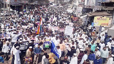 कऱ्हाड : "सीएए हटाव, संविधान बचाव... नही चलेगी नही चलेगी, दादागिरी नही चलेगी...., हिंदुस्थान हमारा है..., हमे चाहीए, आझादी....' या व अशा अनेक घोषणांनी शहर आज दुमदुमले. निमित्त होते नागरिकत्व कायद्याविरोधात बहुजन समाजाच्या वतीने आयोजित निषेध मार्चाचे. कायद्याविरोधात मोर्चात युवक मोठ्या संख्येने सहभागी झाले होते.