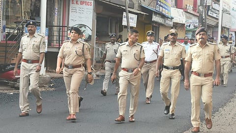 बेळगाव - रमजान ईद, शिव, बसव जयंतीच्या पार्श्वभूमीवर रविवार (ता. १) पोलिसांच्यावतीने शहरातील प्रमुख मार्गावरून पथसंचलन करण्यात आले. सन उत्सवाच्या काळात कोणत्या प्रकारची अनुचित घटना घडू नये. शहराच्या शांततेला धक्का पोहचू नये, यासाठी पोलीस खात्याच्यावतीने बंदोबस्ताची संपूर्ण तयारी करण्यात आली आहे. तसेच समाजकंटकांना इशारा देण्यासाठी काल पथसंचलन करण्यात आले. रविवारी सायंकाळी ४.४५ च्या सुमारास राणी चन्नम्मा चौकातून पथसंचलनाला सुरुवात करण्यात आली. यावेळी कायदा व सुव्यवस्था विभागाचे पोलिस उपायुक्त रवींद्र गडादी, गुन्हे तपास व वाहतूक विभागाच्या पोलीस उपायुक्त पी. व्ही. स्नेहा, खडेबाजारचे सहाय्यक पोलीस आयुक्त ए. चंद्राप्पा, मार्केटचे साहाय्यक पोलीस आयुक्त सदाशिव कट्टीमनी यांच्यासह शहरातील बहुतांशी अधिकाऱ्यांनी या पथसंचलन सहभाग घेतला होता.