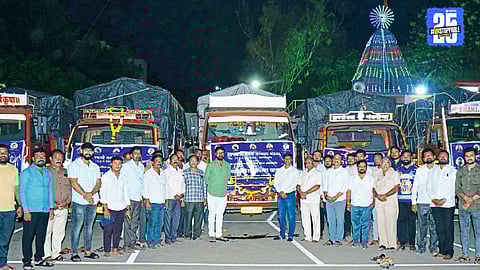 Akkalkot Annachatra Mandal representatives handing over food kits to Solapur district officials; Hirkani Women’s Group aiding flood-hit women.