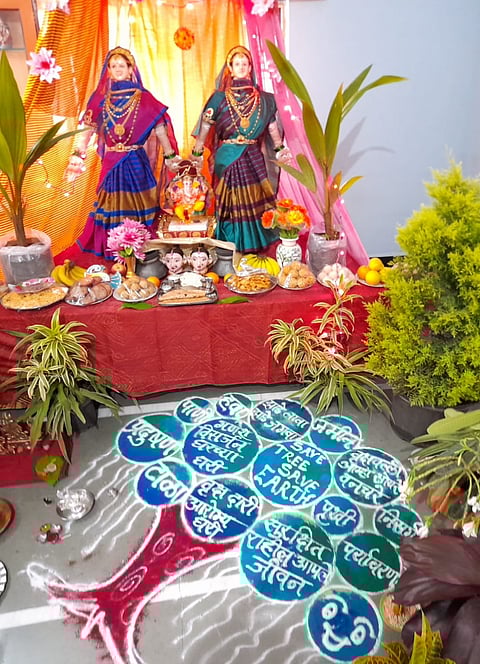 अशात काल सायंकाळी सोनपावलांनी आगमन झालेल्या गौरीसमोर विद्युत रोषणाई व देखावे करून गौरीची स्थापना केली त्यामध्ये गौरी समोर विविध खेळणी, खाद्य पदार्थ, फळे, याचबरोबर प्रबोधनाचे संदेश देणारे फलक लावले.
