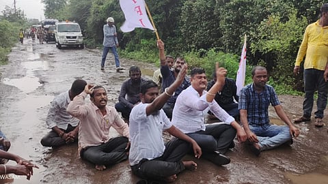 सोलापूर - डी.वाय.एफ.आय.चे कार्यकर्ते चालत गोदुताई परुळेकर नगर ते विजय नगर या मार्गावर मोर्चा काढला. घोषणाबाजी करत झेंडे घेऊन रस्ता रोखो धरून बसले आहेत.