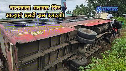 सोलापूर : एसटी चालकाला अचानक फीट आल्यानं नियंत्रण गमावल्यानं बस रस्त्यावर उलटल्याचा गंभीर प्रकार समोर आला आहे. या बसमधून ३५ ते ४० प्रवाशी प्रवास करत होते. एसटी बस पलटी झाल्यानंतर चालकाला एसटीतून बाहेर काढून त्याच्यावर प्रथमोपचार करण्यात आले.