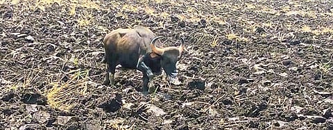 नेर्ले (जि. सांगली) : येथील काळे पाणंद शेताच्या बहे रस्त्यावरील रानात नांगरट चालू असताना गव्याचे आगमन झाले. या अचानक एन्ट्रीने शेतकऱ्यांचे धाबे दणाणले. काहींची तर बोबडीच वळली. शेतात काम करणाऱ्या महिला, पुरुष यांची पळताभुई थोडी झाली. येथील उपसरपंच विश्वास पाटील यांच्या शेतात नांगरट सुरू असताना हा प्रकार घडला.
