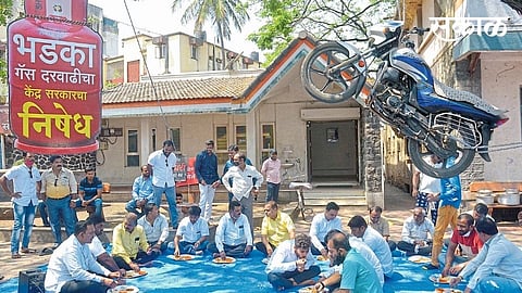 सांगली : वाढत्या महागाईला जबाबदार केंद्र सरकारच्या विरोधात मदनभाऊ पाटील युवा मंचने आज कॉंग्रेस भवनसमोर अनोखे आंदोलन केले. गॅस सिलिंडर व दुचाकी या प्रतिकात्मक भाऊ-बहिणीने आत्महत्या केल्याचे भासवत लटकत ठेवले. तसेच दुखवटा म्हणून 13 वा दिवस न पाळता आत्महत्येच्या दिवशीच सर्व कार्य उरकून कार्यकर्त्यांनी शिरा, भात, आमटी, भाजीचे जेवण केले. या अनोख्या आंदोलनाची आज सर्वत्र चर्चा रंगली.