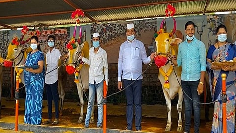 वडगाव मावळा : दरवर्षी वाजत-गाजत व मोठ्या धुमधडाक्यात साजरा होणारा बैलपोळ्याचा सण यंदा कोरोनाच्या सावटामुळे शेतकऱ्यांनी अतिशय साध्या पद्धतीने घरीच साजरा केला. जिल्हा परिषदेचे कृषी व पशुसंवर्धन समितीचे सभापती बाबुराव वायकर यांच्या कुटुंबीयांनी बैलांना मास्क लावून त्यांचे पूजन केले व कोरोना जनजागृतीचा संदेश दिला.