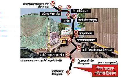 औद्योगिक विकासामुळे गेल्या दोन दशकांत अवजड वाहनांच्या रहदारीने ओसंडून वाहू लागलेला तळेगाव-चाकण-शिक्रापूर रस्ता राजकीय अनास्था आणि प्रशासनाच्या निष्क्रियतेचे प्रतीक बनला आहे. अरुंद आणि खराब रस्ता, वाढती अतिक्रमणे, रस्त्याकडेची अवजड वाहनांची पार्किंग, वाहन चालकांचा बेशिस्तपणा आणि वारंवार होणाऱ्या अपघातांमुळे तळेगाव-चाकण रस्त्यावर वाहतुकीची प्रचंड कोंडी होते.