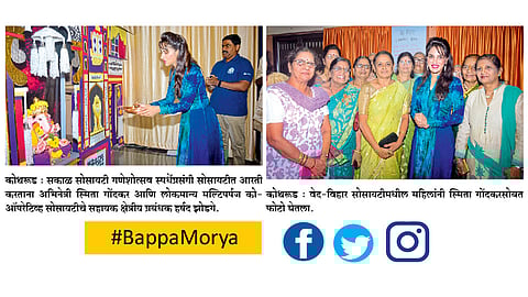 कोथरूड - स्मिताच्या हस्ते मंडळाच्या गणेशाची आरती करण्यात आली. मंडळाच्या अध्यक्षा मनीषा जाधव आणि लोकमान्य मल्टिपर्पजचे सहायक क्षेत्रीय प्रबंधक हर्षद झोडगे या वेळी उपस्थित होते.
