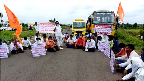 इंदापूर - भगवे वादळ चालक मालक विद्यार्थी वाहतूक संघटनेच्या वतीने बँक व फायनान्स कंपन्यांचे कर्ज एक वर्षासाठी स्थगित करावे. शैक्षणिक सत्र २०२१ -२०२१ हे शासकीय अनुदानातून पूर्णतः पासिंग करुन देण्यात यावे, जोपर्यंत अनलॉक पूर्णतः संपत नाही, तोपर्यंत प्रत्येक बस चालक, मालकास, दरमहा दहा हजार रुपये अनुदान द्यावे. या प्रमुख मागण्याकडे सरकारचे लक्ष वेधण्यासाठी सोमवार दि. १० ऑगस्ट रोजी सकाळी अकरा वाजता पुणे सोलापूर राष्ट्रीय महामार्गालगत इंदापूर डोंगराई सर्कलजवळ रास्ता रोको आंदोलन करण्यात आले. संघटनेचे इंदापूर व माळशिरस तालुका संपर्क प्रमुख लक्ष्मीकांत वाघे, इंदापूर तालुकाध्यक्ष महादेव कोकाटे यांच्या नेतृत्वाखाली हे आंदोलन करण्यात आले. नायब तहसिलदार श्रीमती शुभांगी आधटराव यांना संघटनेच्या वतीने यावेळी निवेदन देण्यात आले.