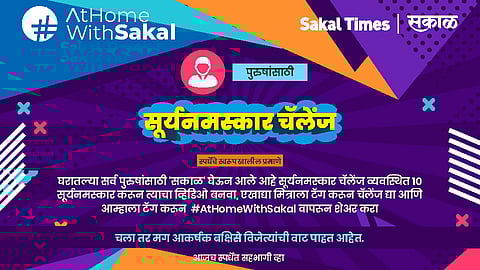 पुरुष आणि आरोग्य हे समीकरण जीम शिवाय पूर्ण होऊ शकतंच नाही. काही पुरुष त्यांच्या स्वास्थ्याकडे लक्ष देण्यासाठी न चुकता जीमला जातात तर काही पुरुषांना असतो जीमला जाण्याचा कंटाळा. त्यामुळे अशा दोन्ही गटांचा विचार करुन आम्ही घेऊन आलो आहोत सुर्यनमस्कार चॅलेंज. सध्या लॉकडाऊनमुळे जीम बंद असलेल्यांसाठी आणि जीमला जाण्याचा कंटाळा करणा-यांसाठी सूर्यनमस्कार हा स्वतःला फीट ठेवण्यासाठी एकदम परफेक्ट मार्ग आहे. तर तुम्हाला यात १० सुर्यनमस्कार व्यवस्थित घालून याचा एक व्हिडिओ बनवायचा आहे. हा व्हिडिओ तुम्हाला तुमच्या एका मित्राला टॅग करुन त्याला देखील हे चॅलेंज द्यायचं आहे. आम्हाला टॅग करुन #AtHomeWithSakal वापरुन शेअर करायचा आहे..यातील विजेत्याला मिळणार आहे आकर्षक बक्षिस.