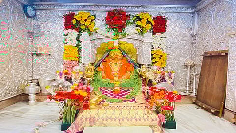 तळेगाव ढमढेरे (पुणे) : अष्टविनायकांतील शिरूर तालुक्यातील रांजणगाव गणपती येथील महागणपतीच्या मूर्तीला आज संकष्ट चतुर्थीनिमित्त आकर्षक पोशाख व सुवर्ण अलंकार परिधान करण्यात आले.