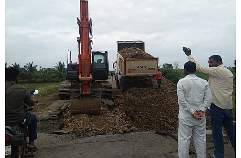 माळेगाव : बारामती-फलटण राज्यमार्गावरील गेल्या दोन दिवसांपासून ठप्प झालेली वाहतूक सुरळीत करण्यासाठी आज सार्वजनिक बांधकाम विभागाने निर्णय घेतला आहे. परिणामी पाहुणेवाडी हद्दीतील पावसाच्या पाण्याने वाहून गेलेल्या पुलासह रस्त्याचे बांधकाम सुद्धपाळीवर सुरू झाले. पुणे आणि सातारा जिल्ह्याला जोडणारा हा महत्वपुर्ण राज्यमार्ग उद्या शनिवार (ता. १७) रोजी दुपारपर्य़ंत वाहतूकीसाठी खूला होईल, अशी खात्रीलायक माहिती बांधकाम खात्याचे उपविभागिय अधियंता विश्वास ओहाळ यांनी कळविली.