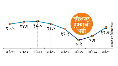 पुण्यात शनिवारी (ता. १८) सरासरीपेक्षा १.४ अंश सेल्सिअस किमान तापमान कमी झाले होते. मात्र, रविवारी सकाळी साडेआठ वाजेपर्यंत ते १.७ अंश सेल्सिअसने वाढून १२.७ अंश सेल्सिअस नोंदले गेले.