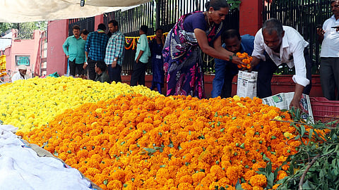 मंचर - 'स्थिरावलेला झेंडूचा दर यंदा दुपटीपेक्षा वाढून १०० रुपये किलो इतका शेताच्या बांधावर झाला आहे. इतर फुलांच्याही बाजारभावात वाढ झाली आहे. गेली दोन महिने झालेल्या मुसळधार पावसाचा फटका फुलशेतीला बसला आहे. अनेक ठिकाणी फुलशेती कोलमडली आहे. उत्पादनापेक्षा मागणी जास्त आहे. त्यामुळे फुलांना चांगले बाजारभाव मिळत आहे. दसर्यापर्यंत बाजारभाव अजून कडाडतील.' असे मंचर येथील फुल विक्रेत्यांनी सांगितले.
