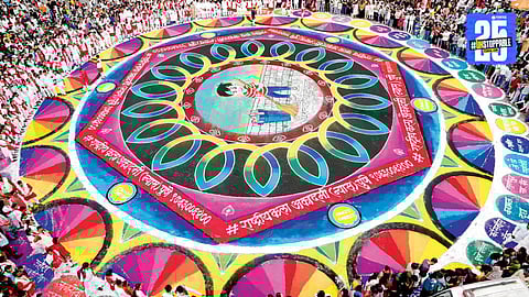 पुणे : पुण्यातील गणेश विसर्जन मिरवणुकीत राष्ट्रीय कला अकादमीच्या सुमारे ३५० हून अधिक कलाकारांनी टिळक चौकात १०० फुटांहून अधिक लांब भव्य रांगोळी काढून विसर्जन मिरवणुकीची शोभा वाढविली. यासाठी २५ पोती गुलाल व १५०० किलो रांगोळी वापरण्यात आली. यंदा ‘कचरा व्यवस्थापन’ हा रांगोळीचा विषय होता.