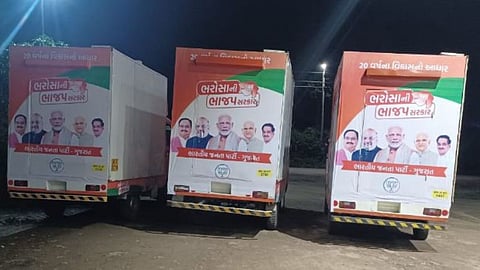 पारगाव : गुजरात विधानसभा निवडणकीचे बिगुल वाजले असून निवडणूक जाहीर होण्या अगोदर एक महिन्यापासून भाजपच्या वतीने गुजरात मध्ये जोरदार डिजिटल प्रचार मोहीम राबवली जात आहे. त्यासाठी महाराष्ट्रातील एलईडी स्क्रीन वाल्या डिजिटल व्हॅनला मोठी मागणी वाढली आहे. महाराष्ट्रातून गेलेल्या एकूण १०० डिजिटल व्हॅन गुजरातच्या खेडोपाडी भाजपचा प्रचार करत आहे यामध्ये पुणे जिल्ह्यातील ३० डिजिटल व्हॅन आहेत.