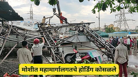 पुणे-नाशिक महामार्गावर मोशीकडून पुण्याकडे येणाऱ्या सेवा रस्त्यावर राजा शिवछत्रपती चौकालगत (वखार महामंडळ चौक) पाच होर्डिंग्ज आहेत. त्याखाली पत्राशेडची दुकाने आहेत. त्यात गॅरेज, गोदाम, हॉटेल, औषधे आदींचा समावेश आहे. पाचपैकी एक होर्डिंग कोसळले. त्याखाली एक दुचाकी, एक टेम्पो व एक मोटार सापडली. दुचाकी, टेम्पोचे अधिक नुकसान झाले.
