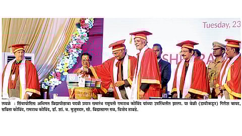 सिंबायोसिस अभिमत विद्यापीठाच्या पंधरावा पदवी प्रदान सोहळा कोविंद यांच्या प्रमुख उपस्थित लवळे येथील कॅम्पसमध्ये मंगळवारी (ता.२३) झाला. या वेळी राष्ट्रपती यांच्या पत्नी सविता कोविंद, राज्यपाल सी. विद्यासागरराव, पालकमंत्री गिरीश बापट, शिक्षणमंत्री विनोद तावडे, संस्थेचे संस्थापक डॉ. शां. ब. मुजुमदार उपस्थित होते. यावेळी ‘स्टुडंटस एज्युकेशनल अँड कल्चरल मूव्हमेंट ऑफ लडाख’चे संस्थापकीय संचालक सोनम वांगचुक यांना ‘डी. लिट’ प्रदान करण्यात आली.