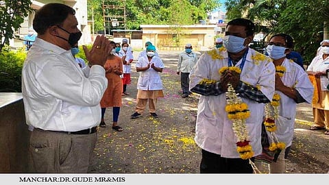 मंचर (पुणे) : पुण्याच्या नायडू हॉस्पिटलमध्ये गेली अडीच महिने स्वतःचा जीव धोक्यात घालून कोरोना योद्धे म्हणून काम करणारे डॉ. महेश गुडे व डॉ अलकनंदा रेड्डी- गुडे हे दांपत्य पुन्हा आंबेगाव तालुक्यातील मंचर उपजिल्हा रुग्णालयात वैद्यकीय सेवेत रुजू झाले आहेत. त्यांचे सोमवारी (ता. ८) पुष्पवृष्टी करून टाळ्यांच्या गजरात स्वागत केले. उत्स्फूर्तपणे झालेले स्वागत पाहून ते भारावून गेले होते. विशेष म्हणजे या दांपत्याचा जवळपास ५०० पोझिटिव्ह रुग्णांशी थेट संपर्क आला आहे.