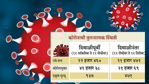 दिवाळीनंतर त्यात घट होऊन ही संख्या ४७१ झाली असून मृत्यूचे प्रमाण जवळपास निम्म्याने कमी झाले आहे. पुणे शहरात दिवाळी आधीच्यामहिन्यात ९ हजार ५३४ नवे रुग्ण आढळून आले होते. त्यात अल्पवाढ होऊन ही संख्या ९ हजार ६०४ झाली आहे. शहरात दिवाळीपtर्वीच्या महिन्यात ५४० रुग्णांचा मृत्यू झाला होता. या महिन्यात १७१ जणांचा मृत्यू झाला आहे.