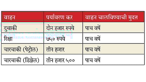 दुचाकी किंवा चारचाकी वाहनाच्या निर्मितीस १५ वर्षे पूर्ण झाल्यावर ते चालवायचे असेल, तर पर्यावरण कर भरणे सक्तीचे आहे. जुन्या वाहनांचा पर्यावरण कर भरून घेताना त्या वाहनामुळे प्रदूषण होत नाही ना, याची खात्री करून घेतली जाते. तसेच, सुरक्षित वाहतुकीसाठीचे निकष ते पूर्ण करीत असेल, तरच कर भरून घेतला जातो. जुन्या वाहनांमुळे प्रदूषणात वाढ होऊ नये म्हणून राज्य सरकारने परिवहन कार्यालयामार्फत २०१० पासून पर्यावरण कर आकारणीस प्रारंभ केला आहे.