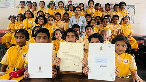 कांतीलाल दंडवते, मुख्याध्यापक जि.प.प्राथमिक शाळा पिंपळगाव तर्फे महाळुंगे (ता.आंबेगाव)पिंपळगाव तर्फे महाळुंगे (ता आंबेगाव) : पंतप्रधान नरेंद्र मोदी यांच्याकडून प्राप्त झालेले पत्र दाखविताना जिल्हा परिषद प्राथमिक शाळेतील विद्यार्थी व शिक्षिका मृणाल गांजाळे/ शिंदे .