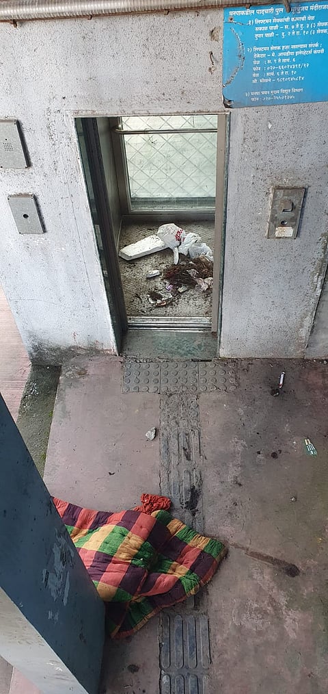 कोथरुड : मैत्रीणींसह सेल्फी घ्यावा म्हणून या उड्डाणपुलावर जाण्याचे आम्ही ठरवले. उड्डाणपुलावरील पाय-यांवरुन सहज वर गेलो. पण पुलावरील अस्वच्छता पाहून शिसारी आली. पुलावरील लिफ्टच्या दरवाजाजवळ काही पिशव्या, दारुच्या बाटल्या आढळून आल्या. खालील लिफ्टचा दरवाजा पूर्ण उघडा होता. बहुतेक तो दरवाजा कोणीतरी पळवून नेला असावा. कोथरुड मधील मृत्युंजय मंदिरालगत असलेल्या पादचारी उड्डाणपुलाची दुरावस्थेबद्दल बोलताना क्षितीजा होले या युवतीने आपला संताप व्यक्त केला.