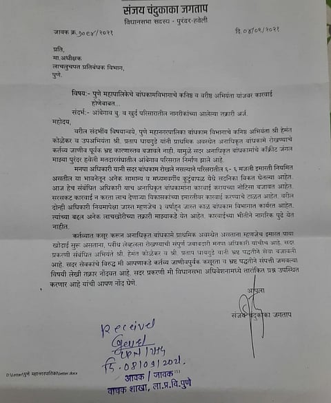 दरम्यान, पुणे महानगरपालिका बांधकाम विभाग क्रमांक दोन अंतर्गत असणाऱ्या आंबेगाव परिसरातील अधिकाऱ्यांनी अनधिकृत बांधकामांवर योग्यवेळी कारवाई न केल्याने अनधिकृत इमारती उभ्या राहिल्या. यामध्ये, कष्टकरी कामगार वर्गातील नागरिकांनी स्वस्तात सदनिका मिळत आहेत म्हणून घेतल्या आहेत. त्यानंतर, इमारती पूर्णपणे उभ्या राहिल्यावर या बांधकामांना बांधकाम विभागाकडून नोटिसा बजाविण्यात आल्या परंतु, त्यातही सरसकट कारवाई न करता दोनच इमारतीवर कारवाई करण्यात आली आहे. उपअभियंता प्रताप धायगुडे व कनिष्ठ अभियंता हेमंत कोळेकर यांनी उर्वरित आठ बांधकाम व्यवसायिकांकडून लाच घेऊन कारवाई केलेली नाही. त्यांनी अशाप्रकारे बरीच बेहिशोबी मालमत्ता मिळविली आहे. संबंधित अधिकाऱ्यांच्या विरोधात आमदार जगताप यांचेकडे स्थानिक नागरिकांनी तक्रारी केल्याने लाचलुचपत प्रतिबंधक विभाग अधीक्षकांना याची चौकशी व्हावी म्हणून लेखी तक्रार आमदार संजय जगताप यांनी केली आहे.