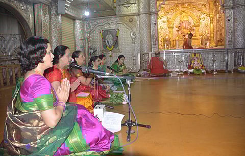 पुणे : ऋषीपंचमीच्या निमित्ताने दगडूशेठ गणपती मंदिरात ‘ओम नमस्ते गणपतये...’चे स्वर निनादले. कोरोनामुळे यंदा सलग दुस-या वर्षी दगडूशेठच्या मुख्य मंदिरात पाच महिलांच्या उपस्थितीत अथर्वशीर्ष पठण झाले. मात्र हजारो भाविकांनी आॅनलाइन पद्धतीने घरबसल्या या सोहळ्यात सहभाग घेतला.