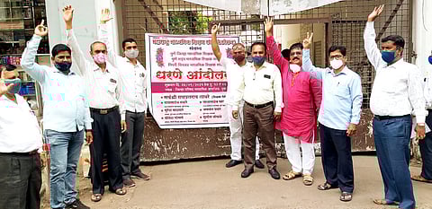 तळेगाव ढमढेरे: पुणे येथे माध्यमिक शिक्षणाधिकारी कार्यालयासमोर विविध शैक्षणिक मागण्यांसाठी "महाराष्ट्र माध्यमिक शिक्षक संघ" (फेडरेशन ) तर्फे शासकीय नियमांचे पालन करुन मोजक्या पदाधिकाऱ्यांच्या उपस्थितीत धरणे आंदोलन करण्यात आले. यावेळी महाराष्ट्र माध्यमिक शिक्षक संघाचे राज्य समन्वयक दादासाहेब गवारे, जिल्हा माध्यमिक शिक्षक संघाच्या उपाध्यक्षा स्नेहल बाळसराफ, पुणे शहर अध्यक्ष सुरेश वाघमारे, पिंपरी चिंचवड संघाचे अध्यक्ष योगेश भोसले, प्राचार्य एस. पी. दोरगे, जे. एम. पवार, विवेकानंद शिंदे, दिपक सोंडकर, व्ही. आर. गायकवाड, अर्जुन रावते, सुरेश वाघमारे व पदाधिकारी उपस्थित होते.