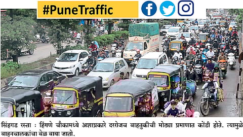 वांजळे पुलाच्या खाली वाहतुकीच्या कोंडीमुळे धायरी गावात जाणारा रस्ता पूर्ण बंद होतो. त्यामुळे सकाळी नऊ वाजता धायरी गावातून दुचाकीवर कार्यालयात जायला निघालेल्या कर्मचाऱ्याची पहिली पंधरा ते वीस मिनिटे याच चौकात जातात. किमान दोन वेळा सिग्नलला थांबल्याशिवाय वडगाव पुलाच्या खालून पुढे जाता येत नाही. माणिकबाग ओलांडताना वाट मिळेल तेथून गाडी दामटत कसाबसा सुटलेला दुचाकीस्वार, संतोष हॉलजवळील भा. द. खेर चौकात हमखास थांबतो. या सिग्नलची गर्दी न्यू पूना बेकरीच्या पुढेपर्यंत आलेली असते. किमान सिग्नलपर्यंत पोचण्यासाठी न्यू पूना बेकरीच्या समोरील पदपथावरूनही आपण वाहन चालवत आहोत, याची भीड तो बाळगत नाही. तीन ते चार सिग्नलमधून संतोष हॉल चौक ओलांडेपर्यंत घरातून निघून त्याला अर्धा तास झालेला असतो. हिंगणे, दामोदरनगर येथून सिंहगड रस्त्याला लागणाऱ्या वाहन चालकाची गर्दी हिंगणे चौकात असते.
