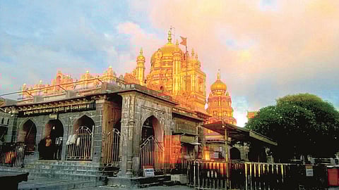 जेजुरी (पुणे) : जेजुरीतील खंडोबा मंदिरावर सकाळची सूर्याची कोवळी किरणे पडल्यानंतर मंदिराचा शिखराचा भाग सध्या सोनेरी दिसत आहे. त्यामुळे सोनेरी किरणांचा जणू खंडोबाला अभिषेकच सुरू असल्याचे दृश्य दिसत असते. मंदिराचे शिखर सोन्यासारखे झाल्याचा भास होत होता.