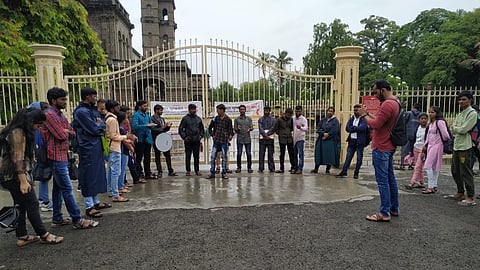 पुणे : सावित्रीबाई फुले पुणे विद्यापीठात शुल्कवाढी विरोधात विद्यार्थ्यांचे बेमुदत घंटानाद आंदोलन सुरू झाले आहे. सोमवार (ता.११) पासून विविध विद्यार्थी संघटनांनी त्यांच्या मागण्या मान्य होईपर्यंत मुख्य इमारत आवारातील संविधान स्तंभाजवळ बेमुदत आंदोलन पुकारले आहे. कुलसचिव डॉ. प्रफुल्ल पवार यांनी सोमवारी सकाळी आंदोलक विद्यार्थ्यांना भेट दिली. सर्व मागण्यांचा गांभीर्याने विचार करून झालेली भरमसाठ शुल्कवाढ जोपर्यंत पूर्ववत होत नाही. तोपर्यंत आंदोलनाच्या भूमिकेवर ठाम आहे, असे मत आंदोलक विद्यार्थ्यांनी व्यक्त केले.